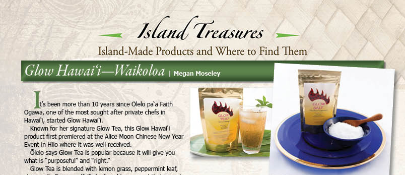Serving Glow Tea was so popular with her clients she began to package it, and now you can find Glow Tea, Glow Salt, and Glow Honey at the Hilo and Kona Island Natural Foods stores, Waimea Healthways, Glow Hawai‘i website, and Café Ono in Volcano.